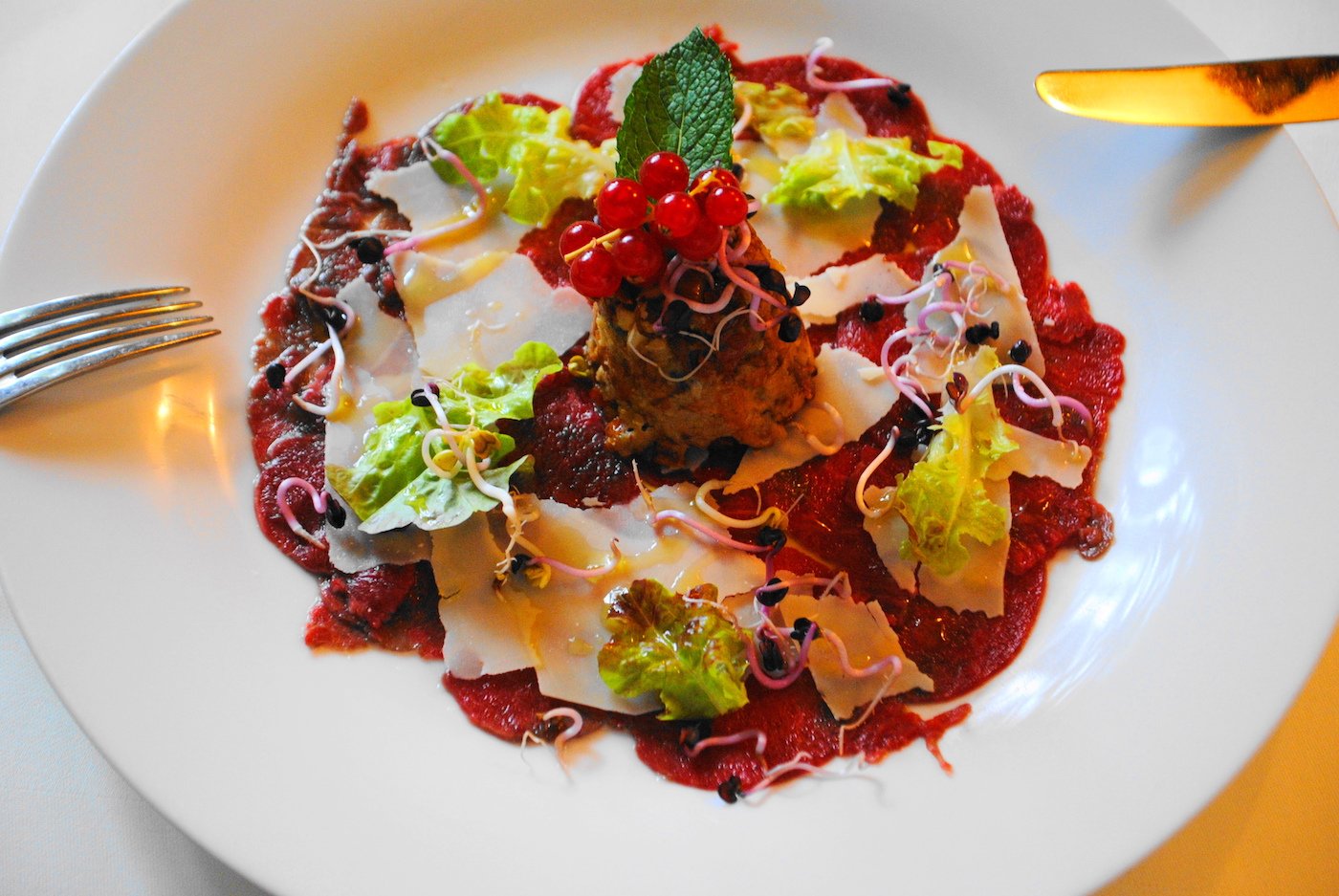 Hauchdünn geschnittene rohe Rinderlende mit Rucola & geraspeltem Parmesan, angemacht mit Zitrone & Olivenöl